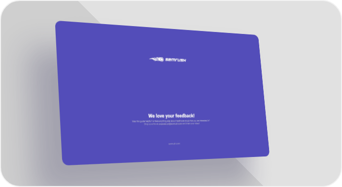 SEMrush Healthcare Study Microsite Page 40 We love your feedback! Was this guide helpful? Is there anything else about healthcare study that you are interested in? Drop us a line at [email protected] and share your ideas! semrush.com