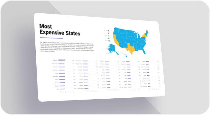 Most Expensive States Our analysis of the cost per click of advertising across fifty-two states in America indicates a dif- ferent scenario for each of the three categories. For the Pharmaceutical category, California, New Jersey, and New York appear to be the most expensive states. For the Dental category, Arizona, Texas, and Colorado are the top three highly expensive states. And for the Hospital Network/ Healthcare Providers category, Texas, California, and Florida happen to be most expensive states (in the respective order).