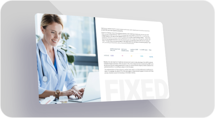 Getting your website fixed for search engines and human users requires you to look into a host of im- portant SEO and user experience elements. As per our findings, most of the analyzed domains in the healthcare industry are not up to par with these crucial on-page elements. With an average total score (health scores) of 40 — a score we cal- culated based on the ratio of the website issues to the number of performance checks — most of the healthcare domains need quite a bit of improvement on the on-page front. Although the average load time for the analyzed domains is not very alarming (at 0.33 seconds), there’s still room for improve- ment. The fact that a one-second delay in web page speed can decrease conversions by about 7 per- cent, according to Kissmetrics, tells us that every second counts. Besides, the vast majority of healthcare domains don’t seem to take advantage of the AMP (Accelerat- ed Mobile Pages) framework. With only about 1.4% of the analyzed domains implementing AMP to cre- ate fast and smooth-loading experience for users, it’s obvious that the majority is either unaware of its potential benefits or is unwilling to adopt it in the first place. The implementation of https protocol is another factor which is not fully addressed on healthcare do- mains. On average, only about 57% of the web pages on these domains appear to function with https and are, therefore, secure for browsing or information sharing. FIXED