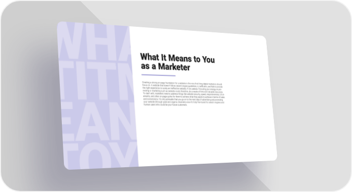 What It Means to You WHA as a Marketer Creating a strong on-page foundation for a website is the very first thing digital marketers should focus on. A website that doesn’t follow search engine guidelines, is inefficient, and fails to provide the right experience is surely an ineffective website, if not useless. Focusing your energy on pro- moting or marketing such as website could, therefore, be a waste of time and valuable resources. To start with, marketers need to address things like website security, speed, responsiveness, UX el- ements, and other on-page quirks for them to achieve what they aspire to achieve in terms of sales and conversions. It’s only advisable that you go on to the next step of advertising and promoting TITM your website (through paid and organic channels) once it’s fully fine-tuned for search engines and human users who could be your future customers. EANS TOYO