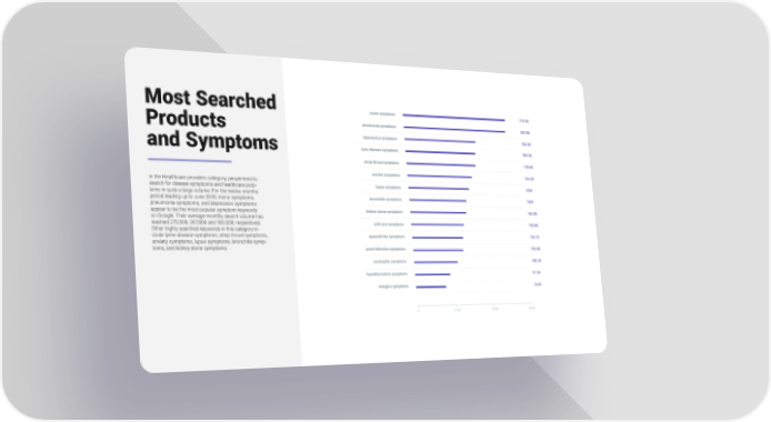 Most Searched Products and Symptoms In the Healthcare providers category, people tend to search for disease symptoms and healthcare prob- lems in quite a large volume. For the twelve months period leading up to June 2019, mono symptoms, pneumonia symptoms, and depression symptoms appear to be the most popular symptom keywords on Google. Their average monthly search volume has reached 270,500, 267,800 and 183,500, respectively. Other highly searched keywords in this category in- clude lyme disease symptoms, strep throat symptoms, anxiety symptoms, lupus symptoms, bronchitis symp- toms, and kidney stone symptoms.