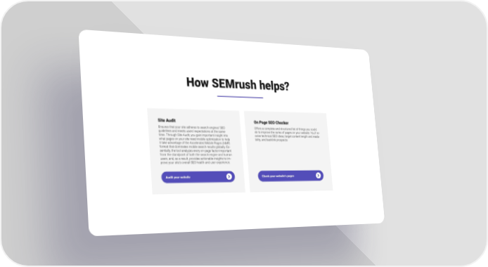How SEMrush helps? Site Audit On Page SEO Checker Ensures that your site adheres to search engines’ SEO Offers a complete and structured list of things you could guidelines and meets users’ expectations at the same do to improve the ranks of pages on your website. You’ll re- time. Through Site Audit, you gain important insight into ceive technical SEO ideas, target content length and reada- what pages on your site need mobile optimization to help bility, and backlink prospects it take advantage of the Accelerated Mobile Pages (AMP) format that dominates mobile search results globally. Es- sentially, the tool analyzes every on-page factor important from the standpoint of both the search engine and human users, and, as a result, provides actionable insights to im- prove your site’s overall SEO health and user experience. Audit your website Check your website’s pages