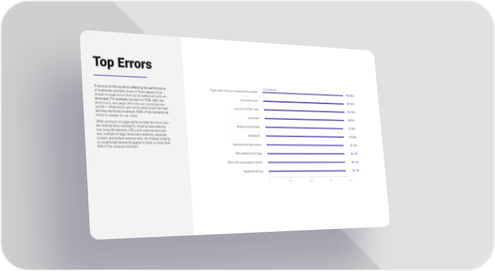Top Errors If we look at the top errors affecting the performance of healthcare domains, most of them appear to be simple on-page errors that can be addressed with rel- ative ease. For example, low text to HTML ratio, low word count, and pages with only one incoming inter- nal link — these errors are not too technical to be fixed but they are found on almost 100% of the domains we chose to analyze for our study. Other common on-page quirks include 4xx errors, bro- ken internal links, missing h1, missing meta descrip- tion, long title element, URLs with a permanent redi- rect, multiple h1 tags, temporary redirects, duplicate content, and broken external links. All of these missing or unoptimized elements appear to exist on more than 90% of the analyzed domains.
